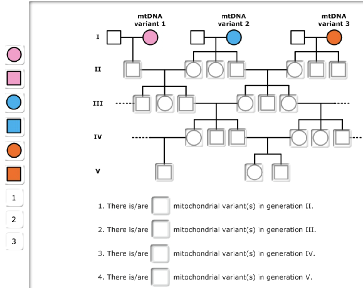 For the individuals in generations II through V, indicate which mtDNA variant they inherited by dragging one of the pink, blue, or orange labels to each target in the pedigree. Then complete the statements below the pedigree by dragging one white label (with the number 1, 2, or 3) to each statement. Labels may be used once, more than once, or not at all.