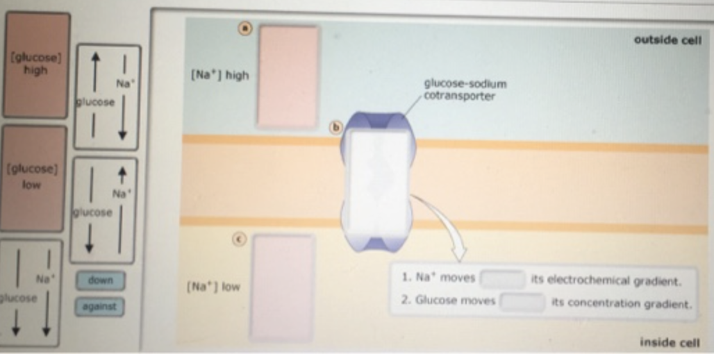 • Drag the blue labels to complete the sentences on the right, indicating how Na+ ions and glucose move through the cotransporter relative to their electrochemical and concentration gradients.